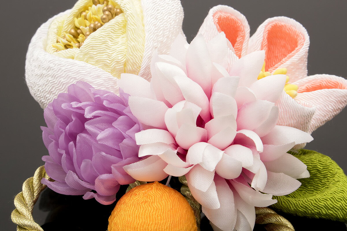 縮緬地のつまみ細工の椿にピンポンマムなどの花や玉飾り、金色に輝く紐飾りがアレンジされています。